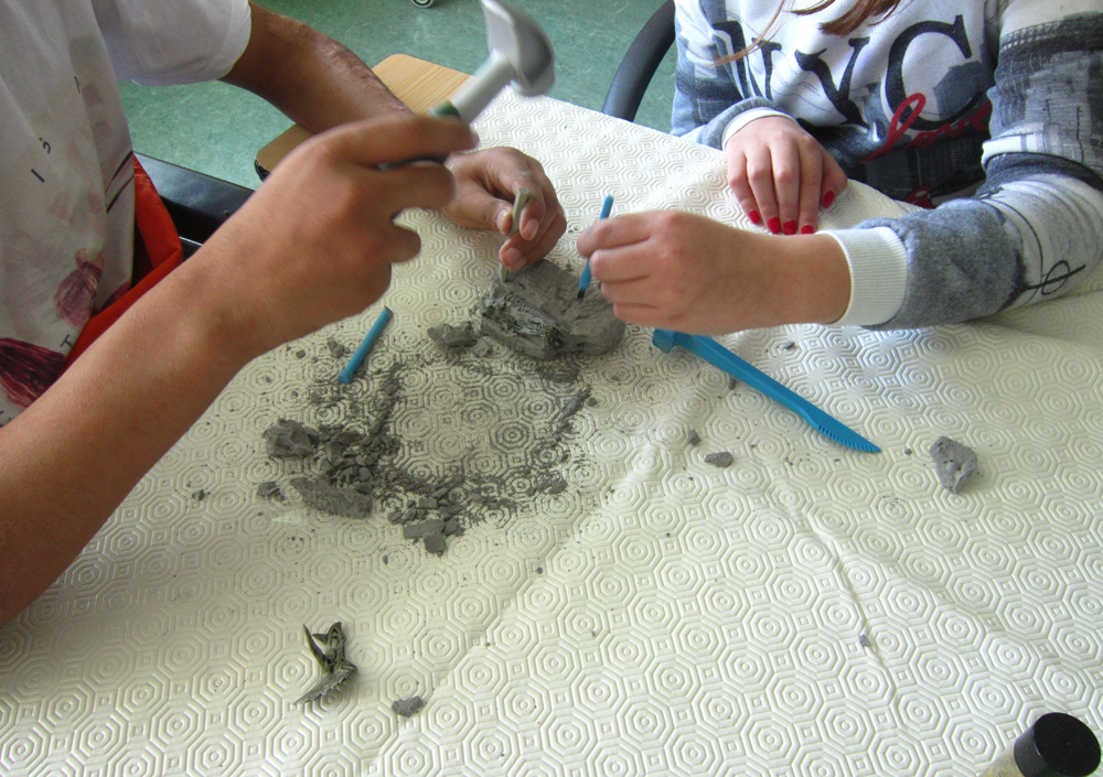 A pedido do Rúben, organizámos um encontro com várias atividades sobre paleontologia. A primeira sessão ocorreu no primeiro período. No entanto, os alunos internados já não são os mesmos. Por isso, o Rúben, cada vez que olhava para as duas rochas com esqueletos de dinossauros, implorava aos deuses e às professoras Sónia e Sandra que o inevitável acontecesse.