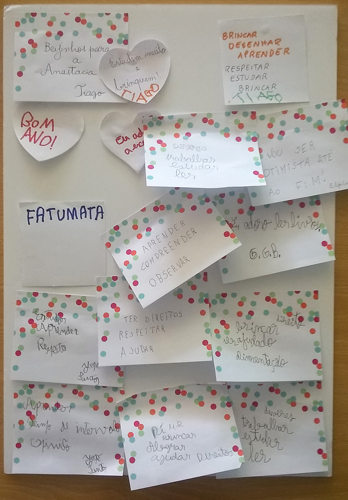 Depois de os professores cantarem o hino da escola, os alunos foram convidados a refletir sobre o tema escola e o seu significado na vida de cada um. Surgiram palavras como crescer, estudar, ser, aprender, algodão, brincar, números, trabalhar, colegas numa chuva de ideias que nos conduziu aos deveres e aos direitos dos alunos neste espaço que se pretende acolhedor e pleno de conhecimentos e criatividade.